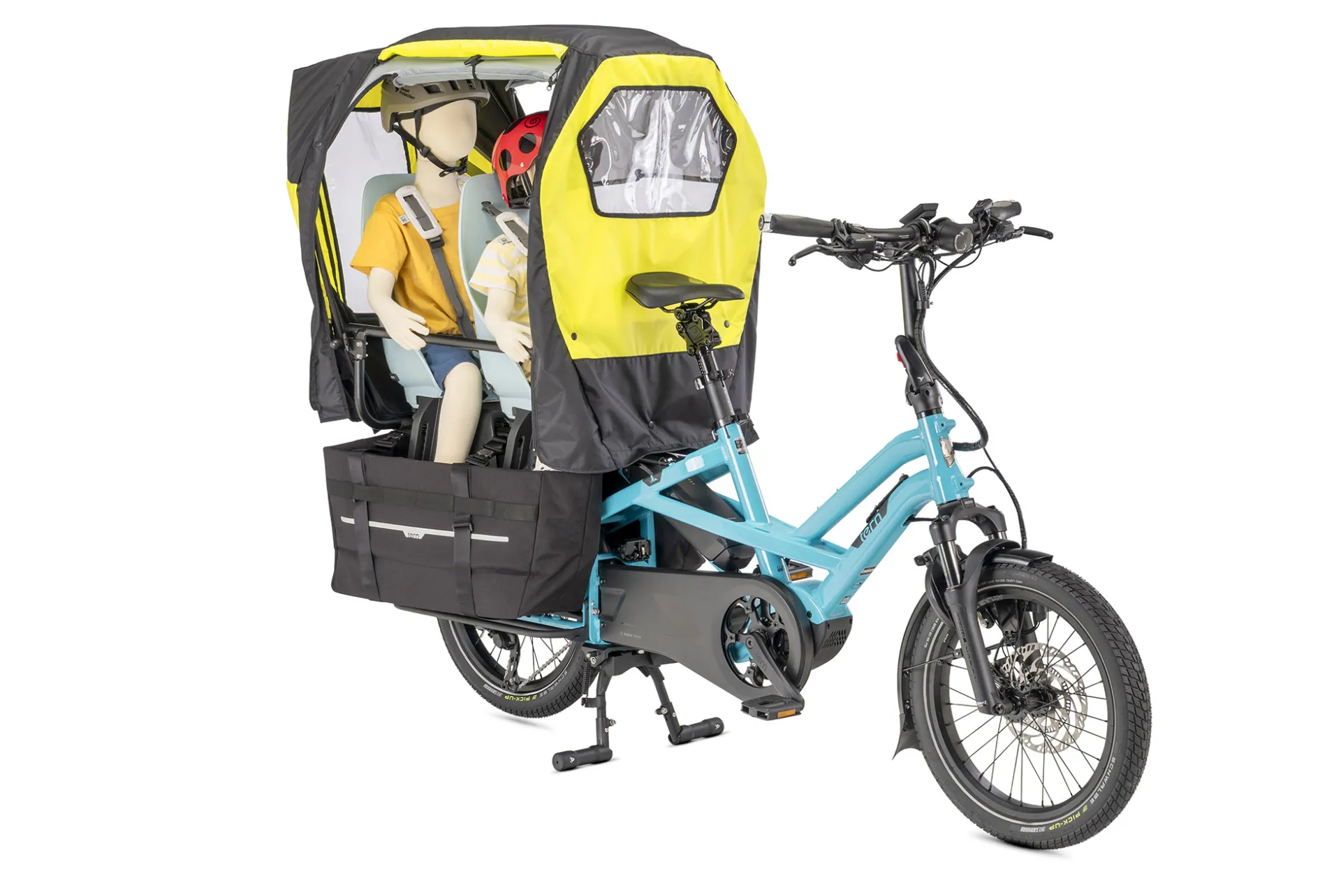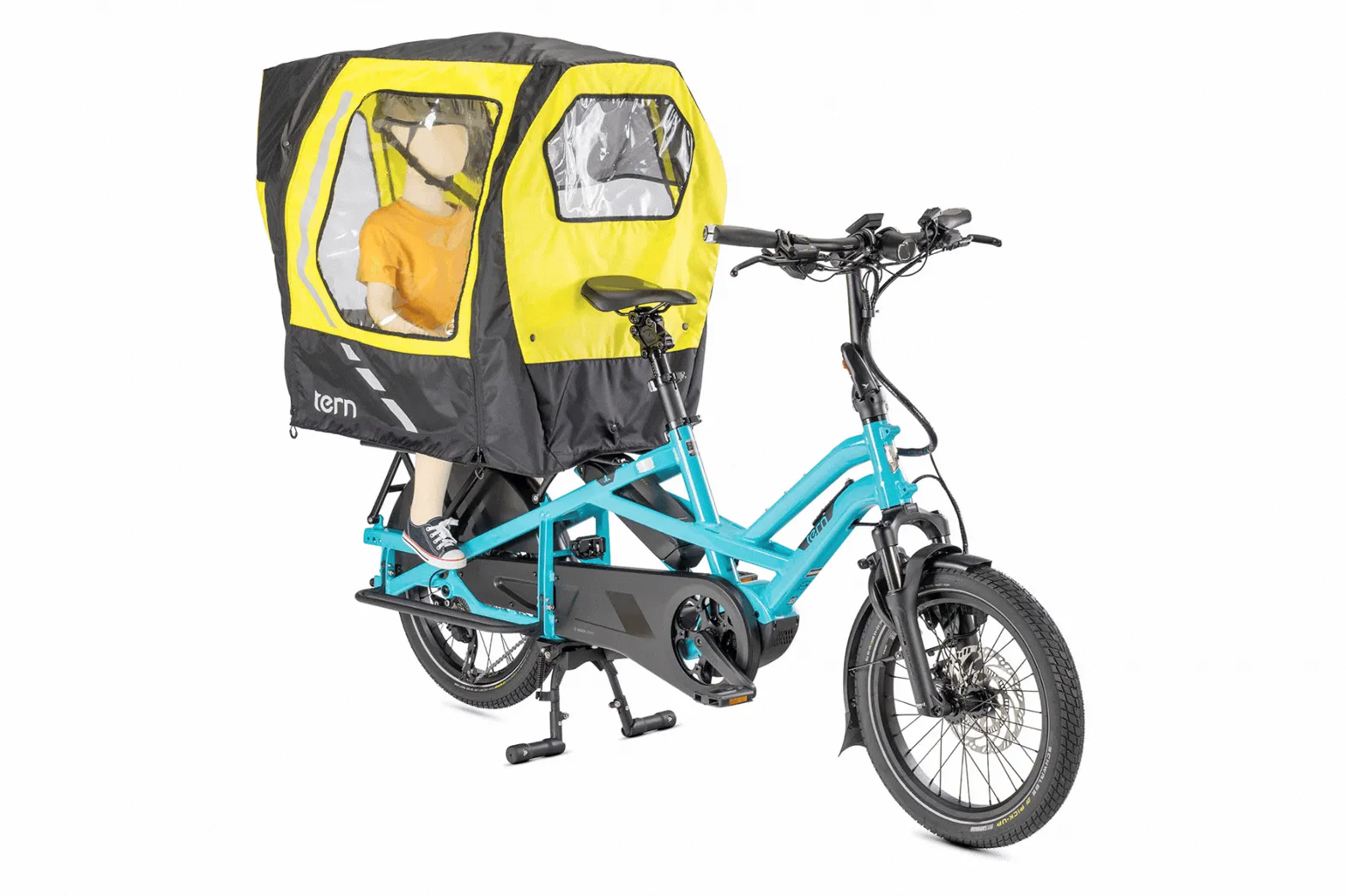 Auvent de pluie pour les passagers enfants sur les vélos cargo Tern, les gardant au sec et protégés des éléments